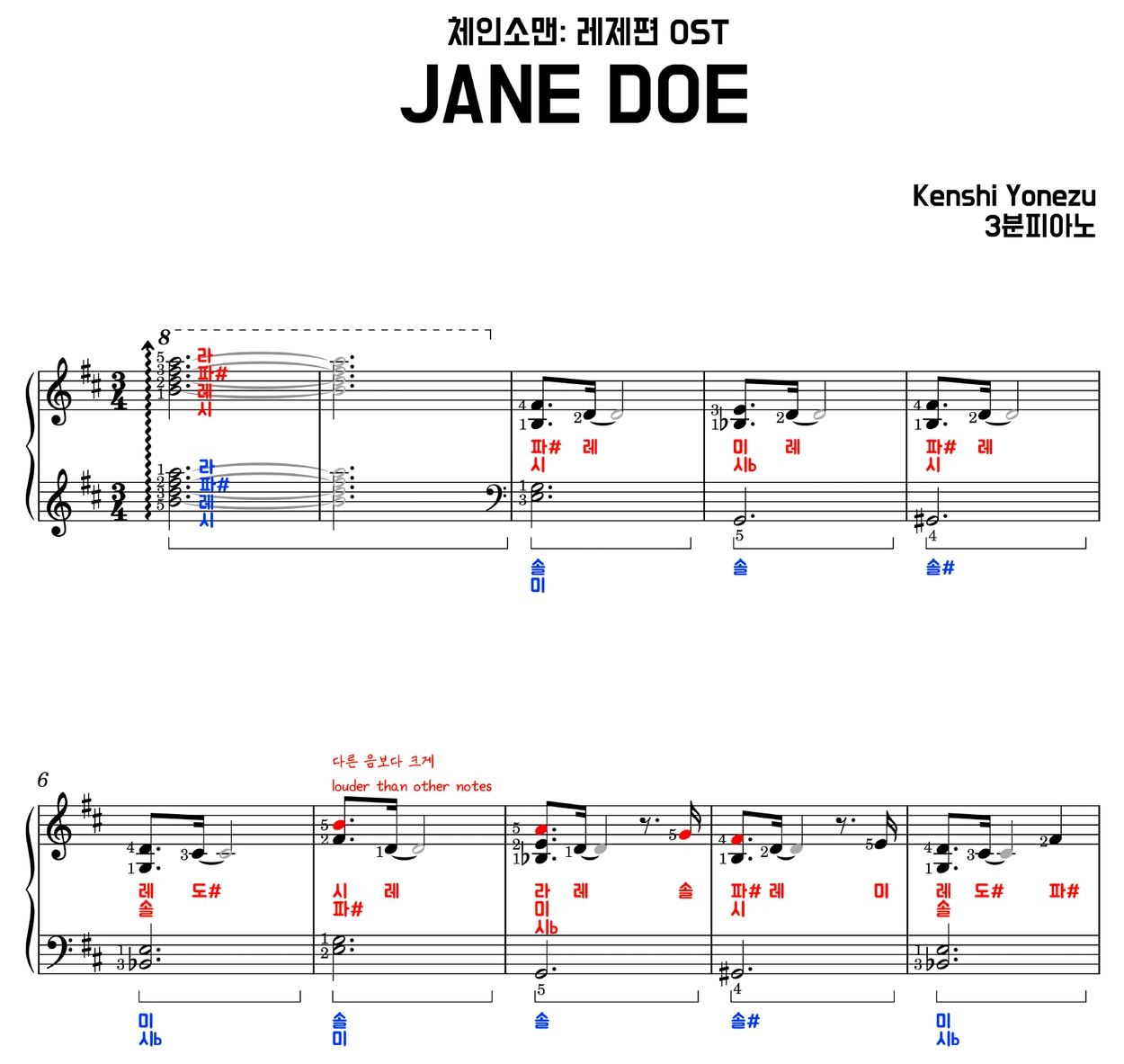 제인도 피아노 악보 (계이름 악보) | JANE DOE 체인소맨 OST | 요네즈 켄시