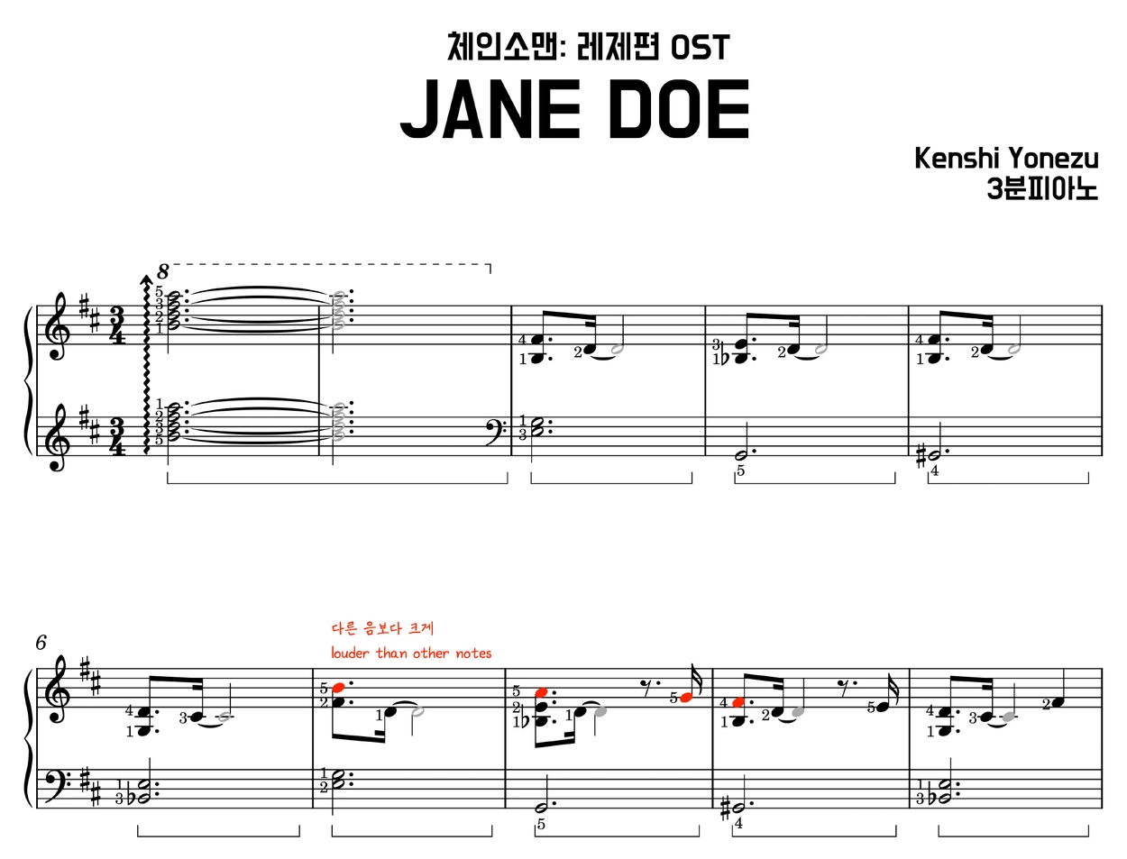 제인도 피아노 악보 (일반 악보) | JANE DOE 체인소맨 OST | 요네즈 켄시