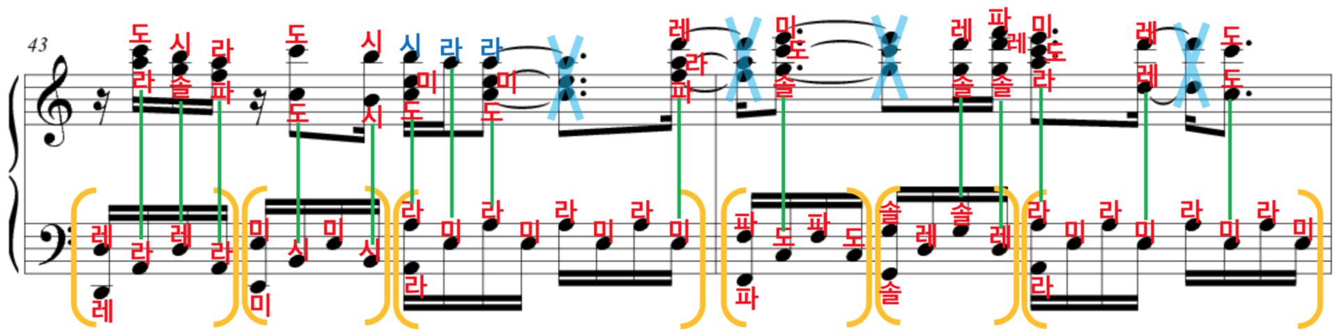 왼손을 언제치는지, 오른손에 어떻게 끼워넣는지가 표시되어 있습니다.