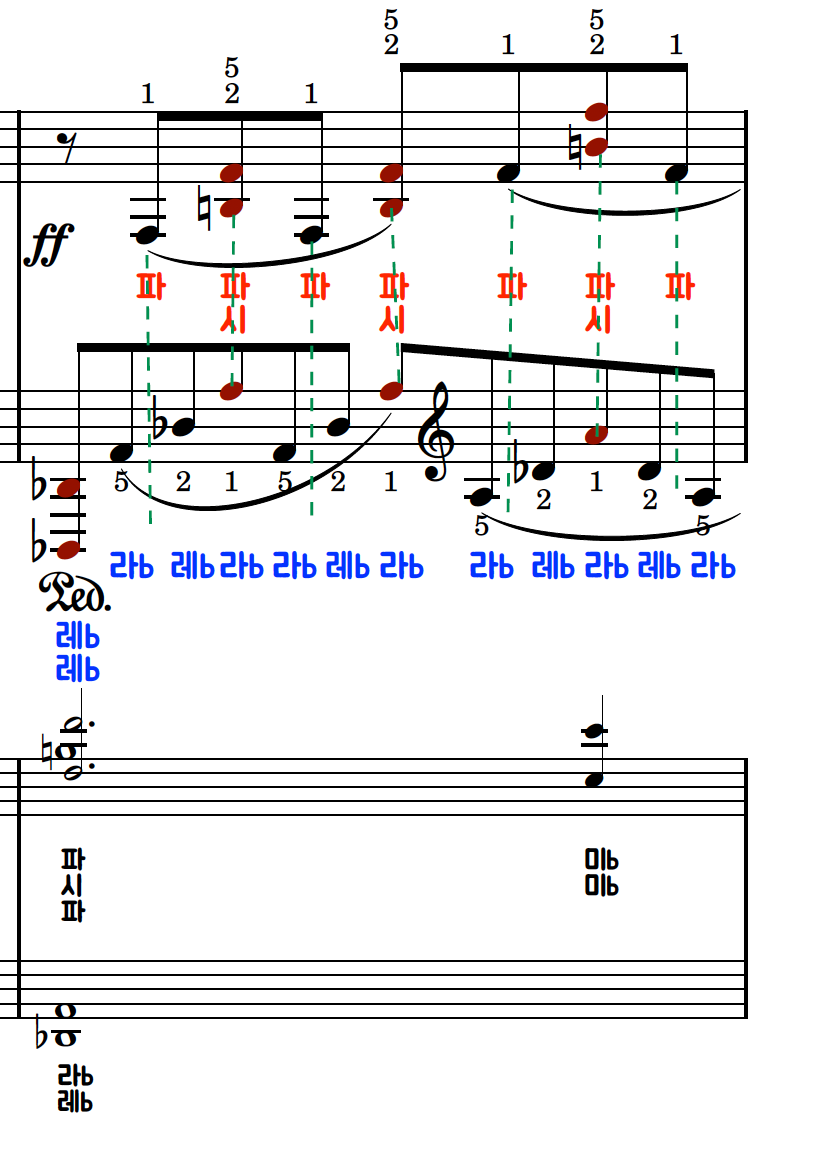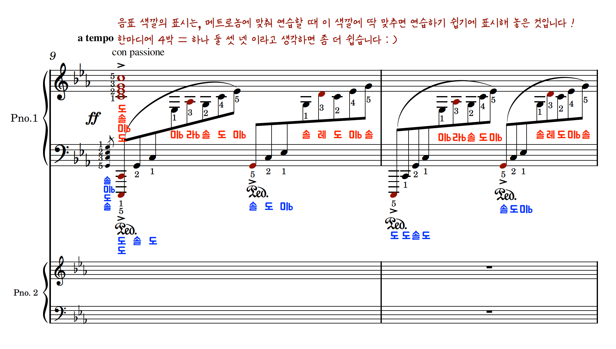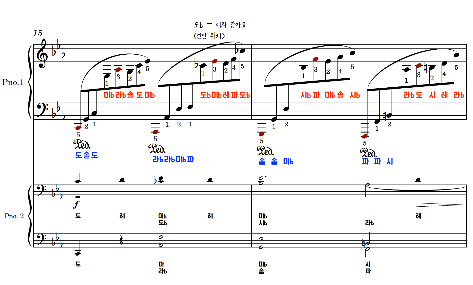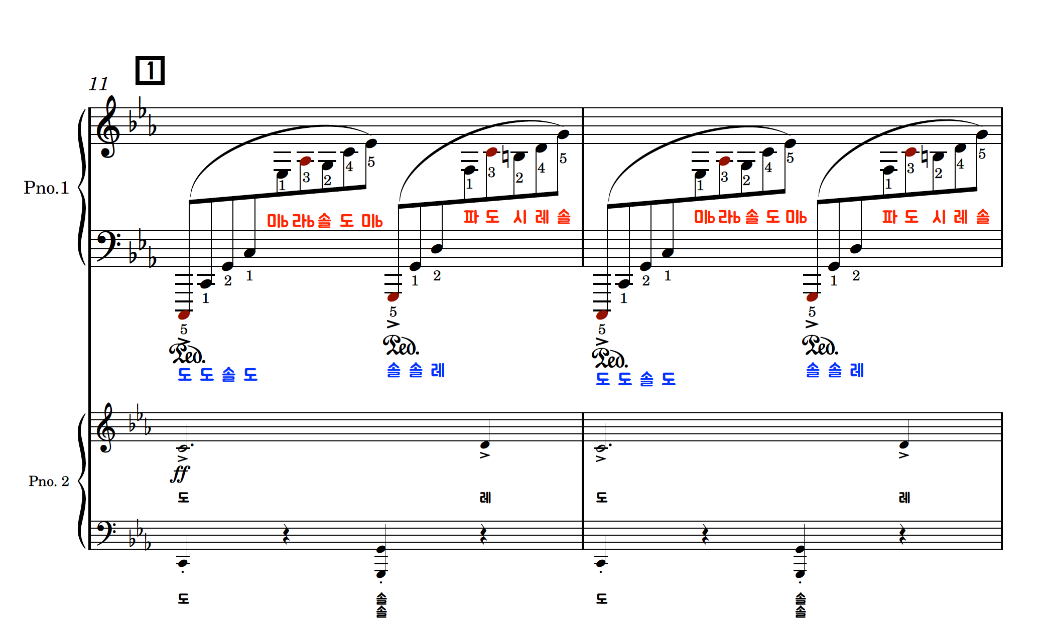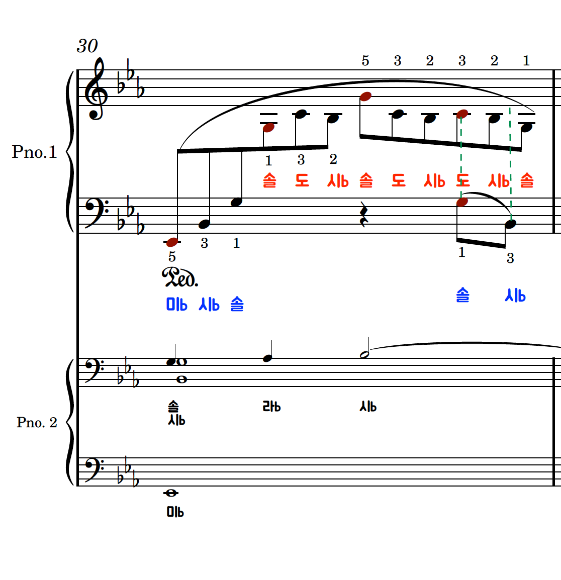 (piano 1 , piano 2 모두 계이름이 적혀있어요) - 손번호, 페달, 프레이즈가 모두 적혀있고