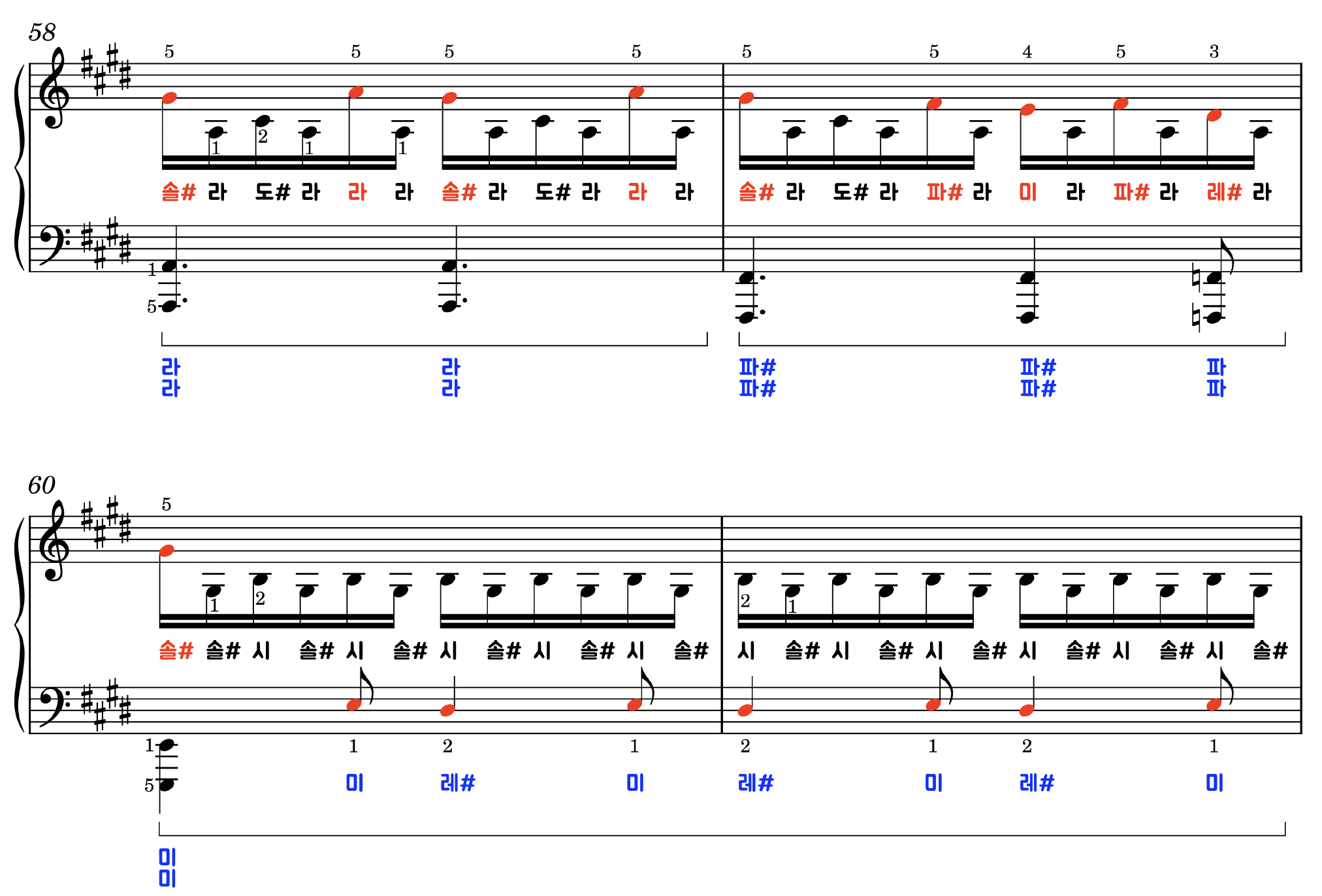 - 계이름, 손번호, 페달이 적혀있는 악보이며